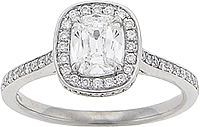 This beautiful engagement ring setting is made by Henri Daussi and features small round brilliant micro-pave set side diamonds. These diamonds are set around your choice of a center diamond and half way around the band. The ring is currently shown with a .75ct center cushion cut diamond but can be ordered for any shape/size center diamond, as listed below. Total carat weight may differ depending upon the weight of your center diamond.Price: $1,600.00
