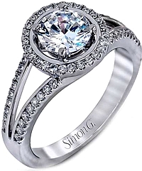 This diamond engagement ring by Simon G has a split shank with pave set diamonds. There is also a pave set diamond halo that is made specially to fit around the diamond of your choice.Price: $2,156.00