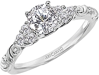 This beautiful engagement ring setting by Art Carved features clustered side diamonds on each side of the center stone. The band has floral carving detailed highlighted with diamonds.Price: $1,210.00