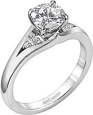 This beautiful engagement ring setting by Art Carved has a small split shank that has clustered diamonds in the shape of a trillion on each side of the center stone.Price: $964.00