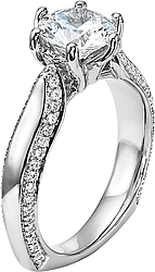 This sleek and contemporary engagement ring setting by Diana features a six prong head with round brilliant pave-set diamonds going 3/4 the way around the band.Price: $1,560.00