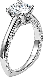 This contemporary engagement ring setting by Diana features a four prong head and has pave-set diamonds going around the 4 sides of the band.