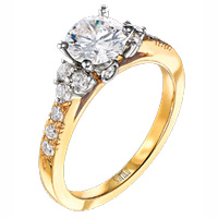 This beautiful engagement ring setting is made by Scott Kay in 19 karat yellow gold. On either side of your choice of a center diamond are three prong-set round brilliant diamonds. In addition there are 6 round diamonds pave-set on the band. Finally two round brilliant "surprise" diamonds are bezel-set on the top and bottom of the mounting.Price: $4,350.00
