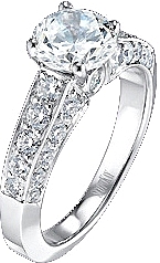 This beautiful engagement ring setting is made by Scott Kay and features 30 round diamonds, which are pave-set on the top and two sides of the front half of the band.