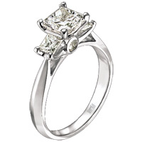 This classic style three stone engagement ring setting by Scott Kay features a princess cut side diamond on either side of your choice of a center diamond.Price: $3,830.00