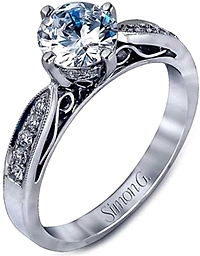 This diamond engagement ring has a scroll pattern along the profile of the ring. In addition there are pave-set round diamonds going half-way around the band.