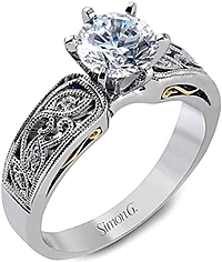 This diamond engagement ring by Simon G has pave-set diamonds inside an intricate floral design.