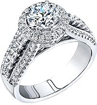 This diamond engagement ring by Simon G has three rows of pave set diamonds. In the center is a pave set diamond halo that is made to fit perfectly around the center diamond of your choice.Price: $3,850.00