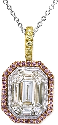 This beautiful Simon G pendant features a 1.00ct mosaic center with rose gold surrounding it with pink pave diamonds. The bale is yellow gold with pave set yellow diamonds for an elegant look.