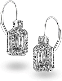 This beautiful pair of white gold Simon G earrings features a baguette in the center with a milgrain edge and pave diamonds surrounding the stone.