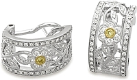 This stunning pair of white gold Simon G earrings features a floral design with bezel set diamonds and milgrain detail. At the center of the flower is a yellow diamond and the edges of this earring have one row of pave set diamonds for an elegant look.