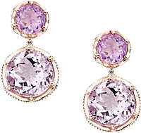 Dual round gem stones in bold lilac Amethyst and crystalline Rose Amethyst sit atop one another for fresh, femininely styled signature earrings. Set in eye-catching 18k rose gold bezels, these sweet stunners attract light for a fantasia in a beautiful, blushing color combination