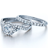 This beautiful engagement ring setting is from the Verragio Couture Collection and it features round brilliant pave set diamonds that crisscross toward your choice of a center stone with a diamond halo surrounding it.Price: $3,050.00